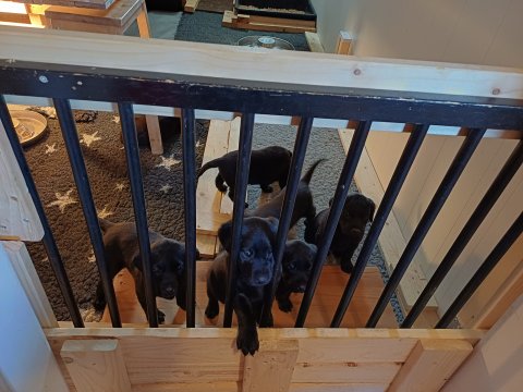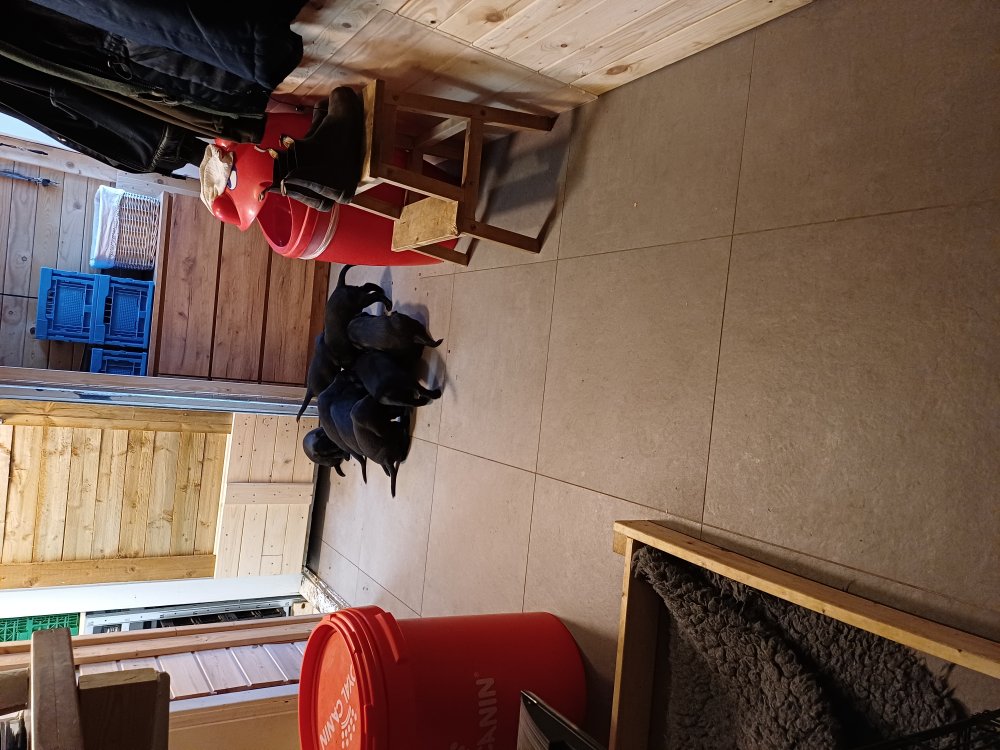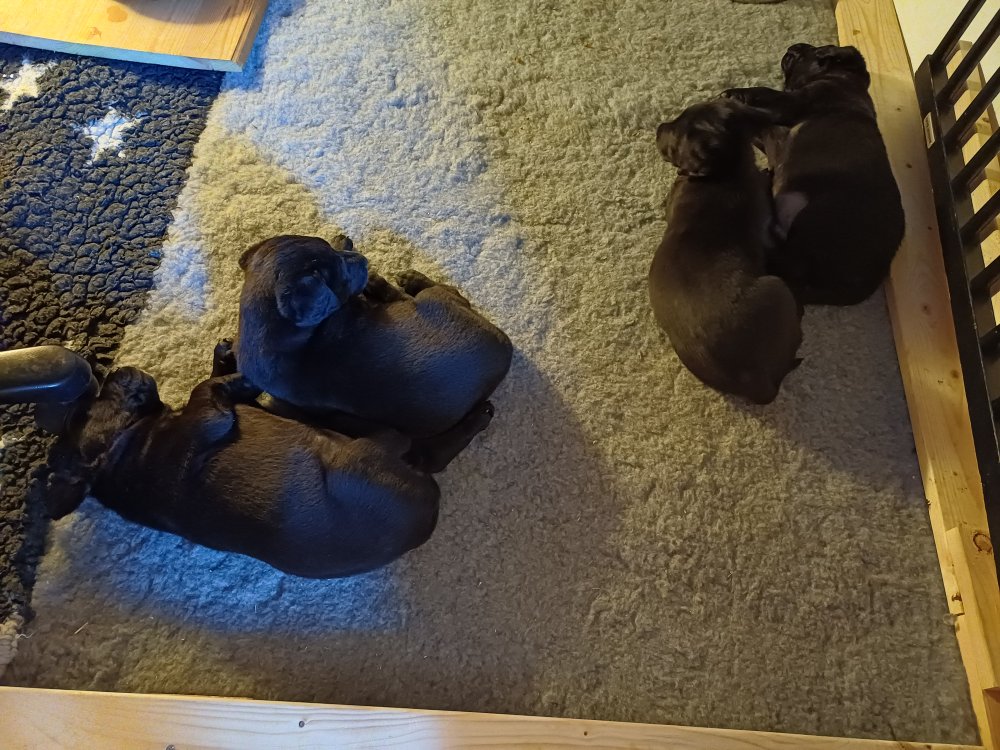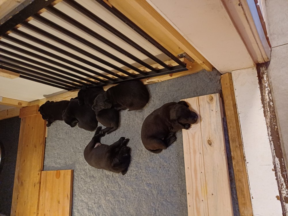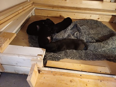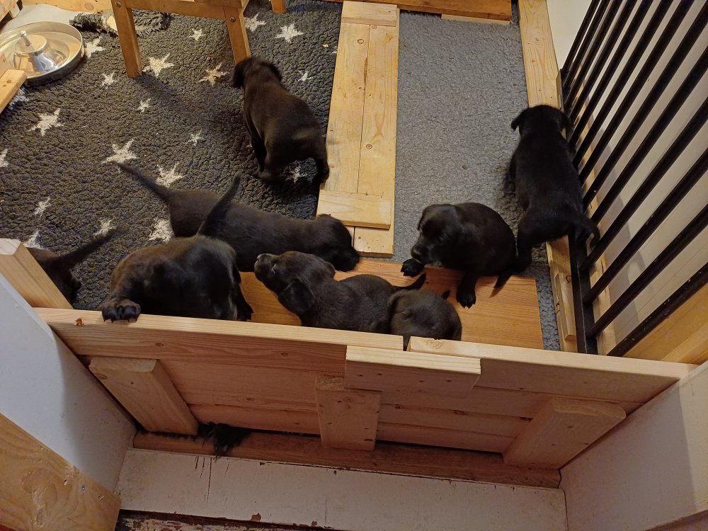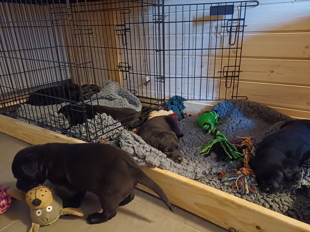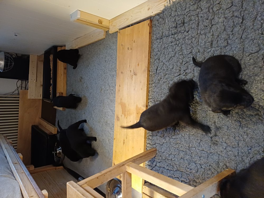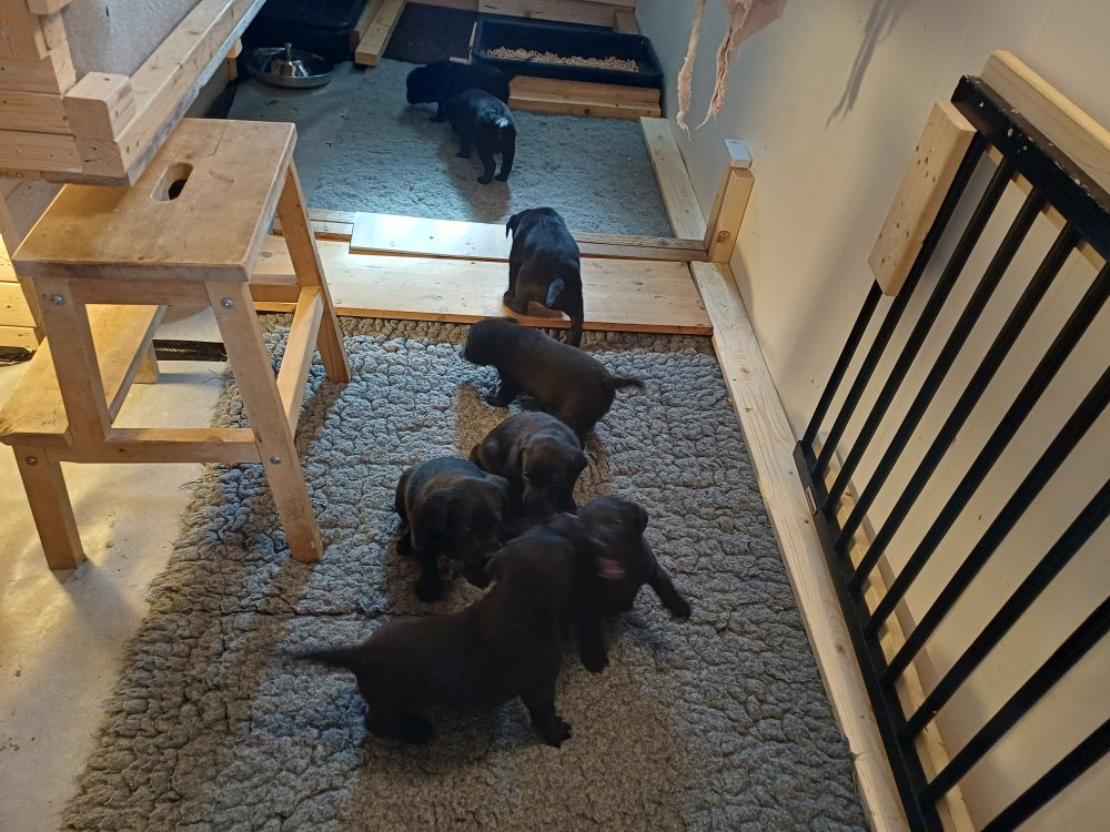 Uge 5 i hvalpekassen Først på uge blev hvalpe chippet, så vi har styr på dem. Hvalpene har i denne uge været lidt i "hvalpebørnehave", de er meget nysgerrig på de nye ting og omgivelser. De kommer rigtig gerne hen til lågen for at hilse på de andre hunde og os.De er så småt begyndt at bruge "hunde WCét" til det store, sjovt at se dem løbe ud af hvalpehule og hen i området med "hunde WCét". I hvalperummet sker der også mere og mere, der bliver prøvet kræfter, så nogle gange kan man høre nogle høje hyl. General er de nogle rigtig søde hvalpe der opfører sig som små hvalp skal, de prøver kræfter med hinanden, spiser, og sover. De nyder at ligge i deres hvalpekasse hule, hvor de sover næsten hele natten. Kate elsker at ligge inde sammen med dem, men nogle overlader hun dem til mormor Amy
