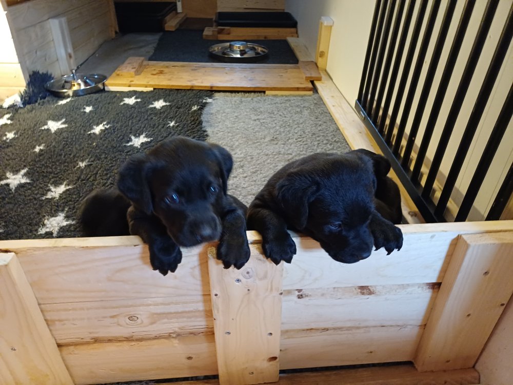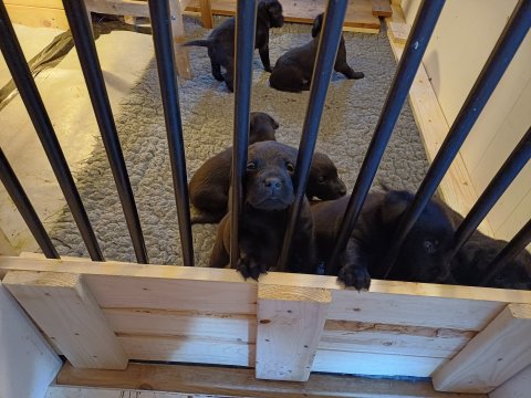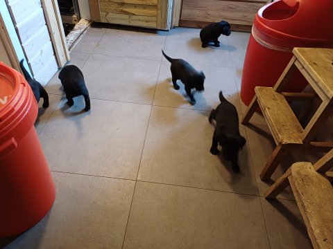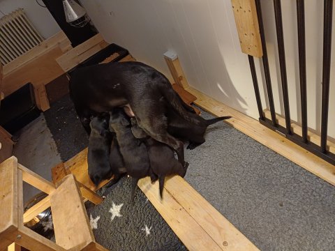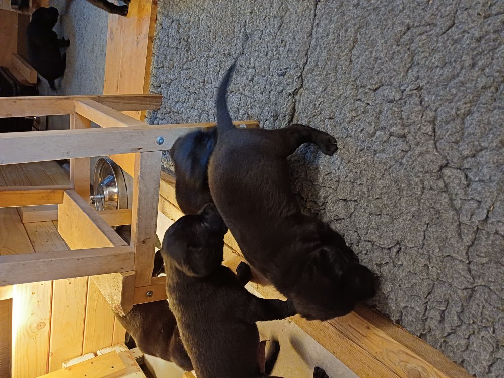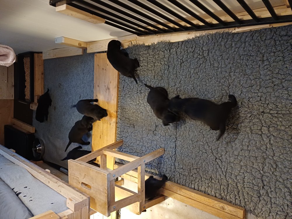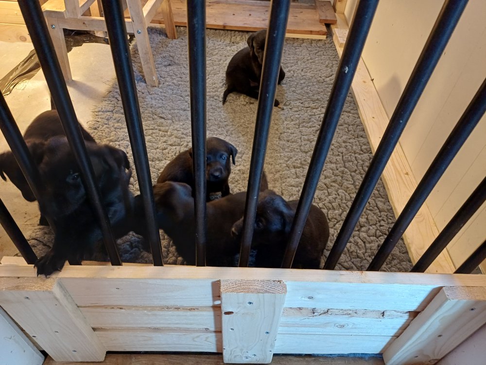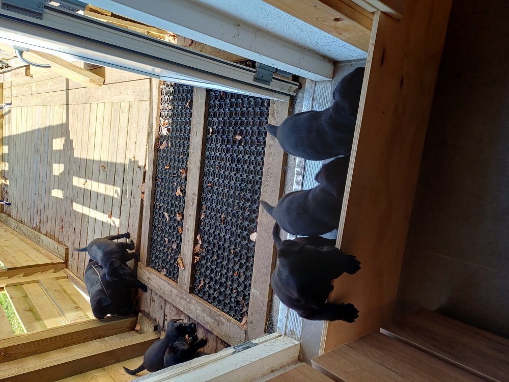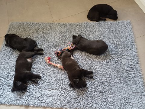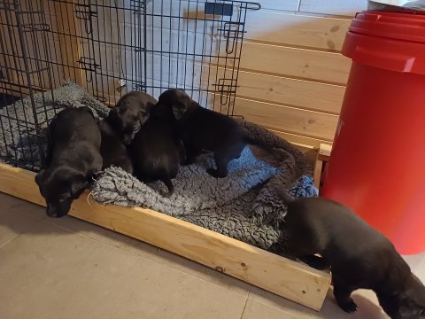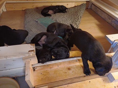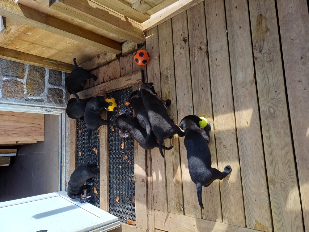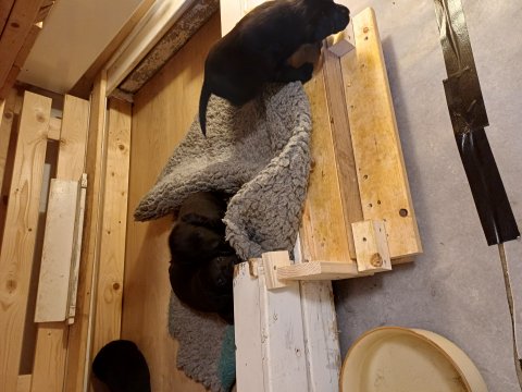 Uge 5 i hvalpekassen Først på uge blev hvalpe chippet, så vi har styr på dem. Hvalpene har i denne uge været lidt i "hvalpebørnehave", de er meget nysgerrig på de nye ting og omgivelser. De kommer rigtig gerne hen til lågen for at hilse på de andre hunde og os.De er så småt begyndt at bruge "hunde WCét" til det store, sjovt at se dem løbe ud af hvalpehule og hen i området med "hunde WCét". I hvalperummet sker der også mere og mere, der bliver prøvet kræfter, så nogle gange kan man høre nogle høje hyl. General er de nogle rigtig søde hvalpe der opfører sig som små hvalp skal, de prøver kræfter med hinanden, spiser, og sover. De nyder at ligge i deres hvalpekasse hule, hvor de sover næsten hele natten. Kate elsker at ligge inde sammen med dem, men nogle overlader hun dem til mormor Amy
