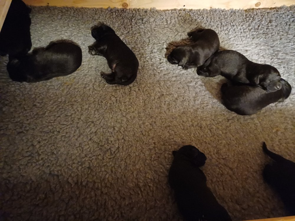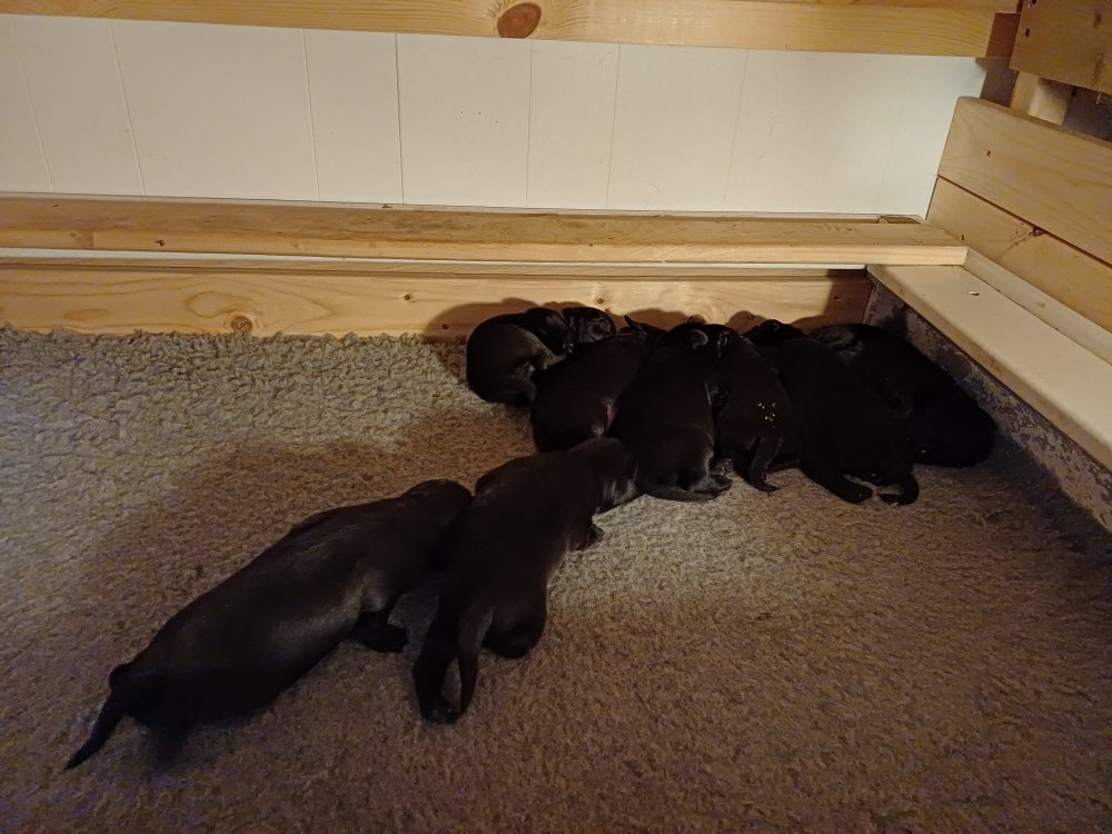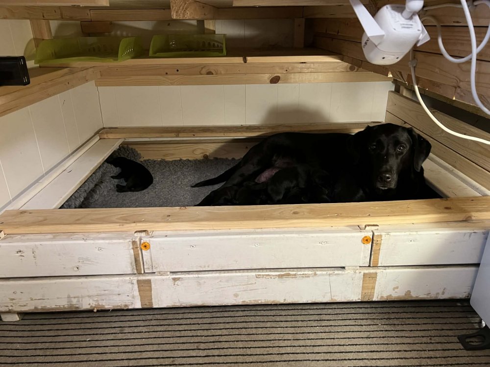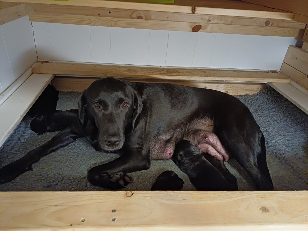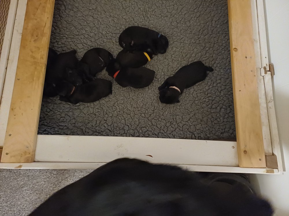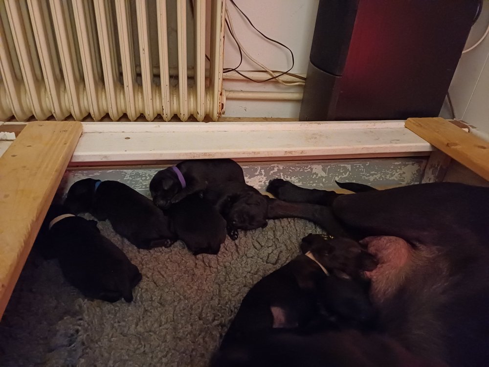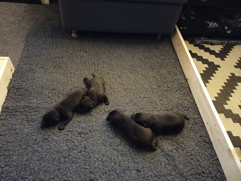 Vi er også begyndt at kunne ane små sprækker ved øjnene, så det bliver så spændende at se de små øjne, når de kommer frem. Kate er en rigtig god mor og hun nyder livet i hvalpekassen, hvor tiden stadig væk går tiden med at spise og sove. De andre hunde er tit inde og hilse på. Kate kommer også ind til os andre i stuen, når der ro i hvalpekassen for være sammen med resten af familien.