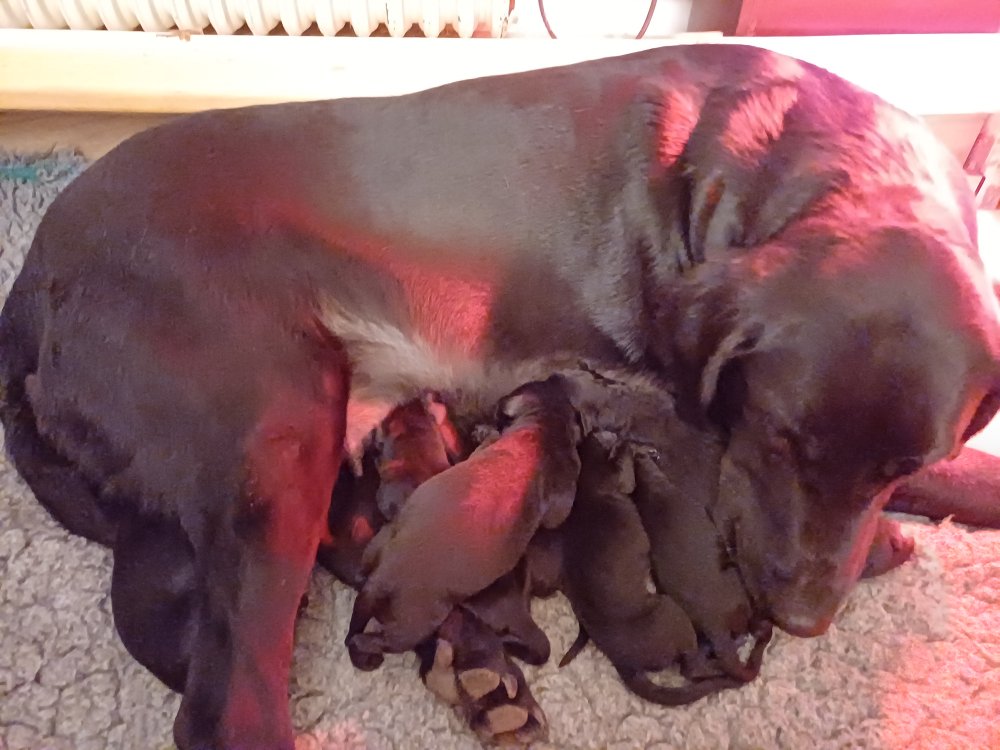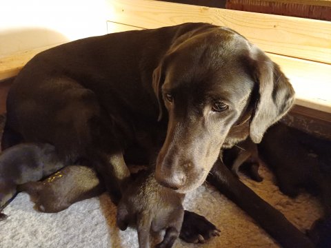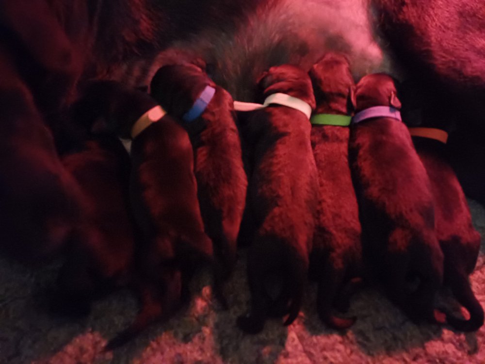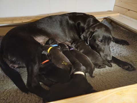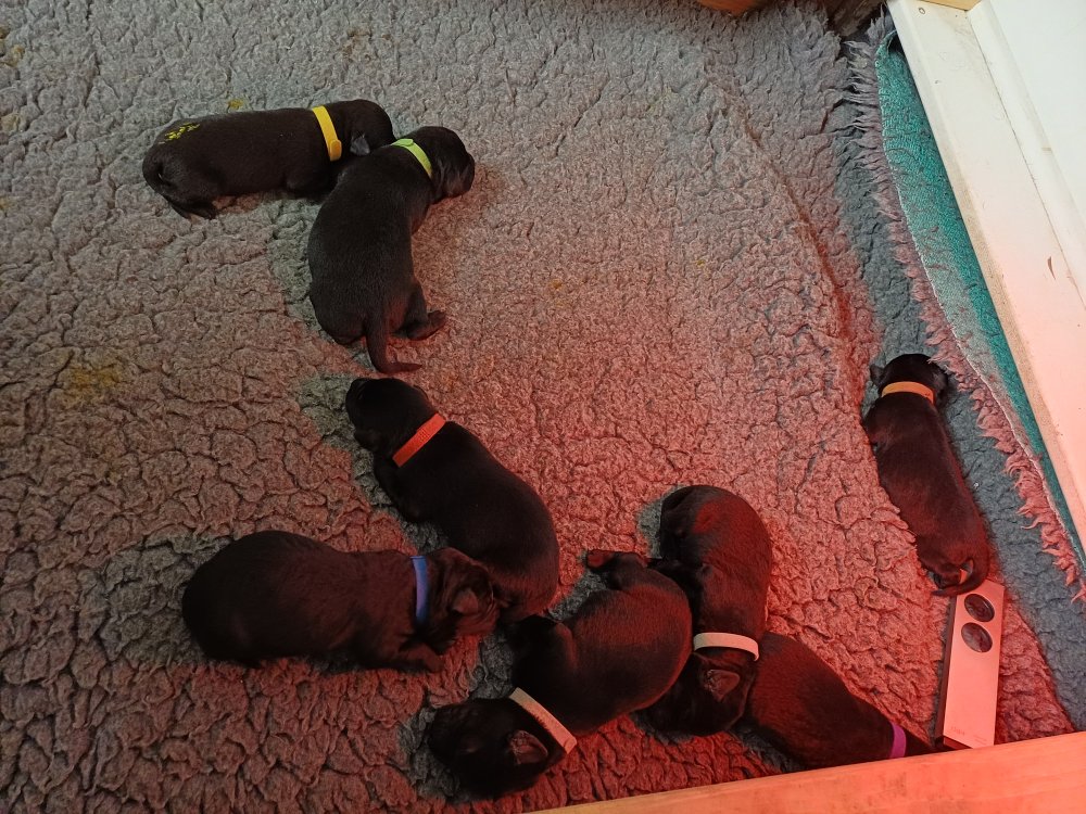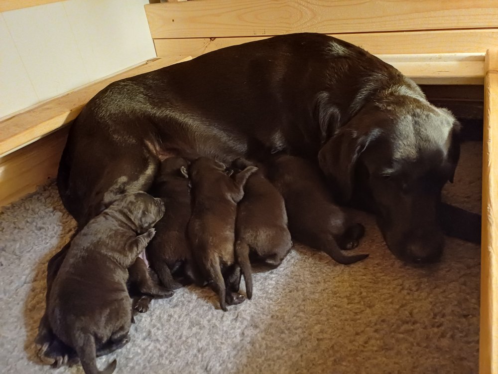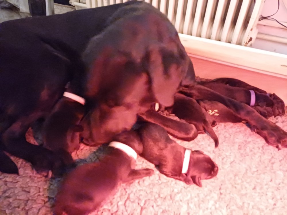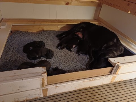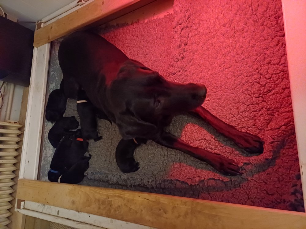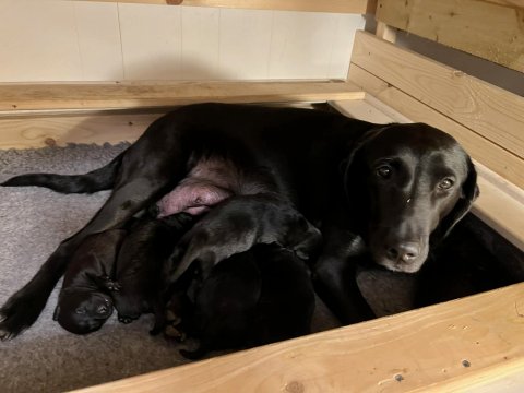 Vi er også begyndt at kunne ane små sprækker ved øjnene, så det bliver så spændende at se de små øjne, når de kommer frem. Kate er en rigtig god mor og hun nyder livet i hvalpekassen, hvor tiden stadig væk går tiden med at spise og sove. De andre hunde er tit inde og hilse på. Kate kommer også ind til os andre i stuen, når der ro i hvalpekassen for være sammen med resten af familien.