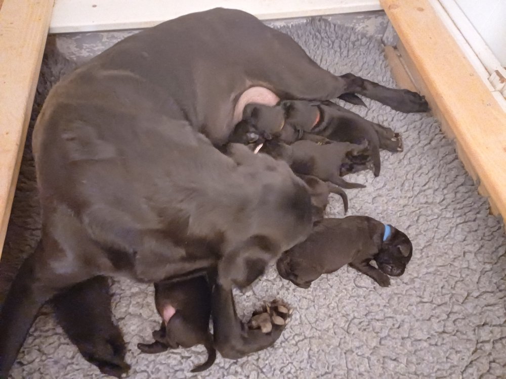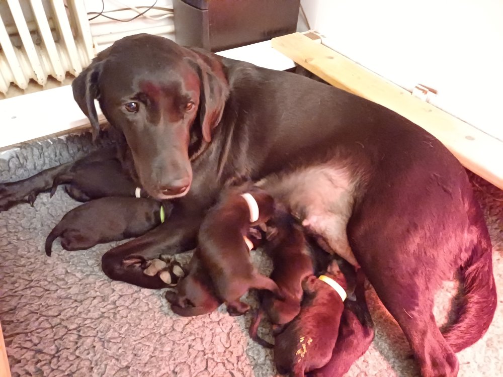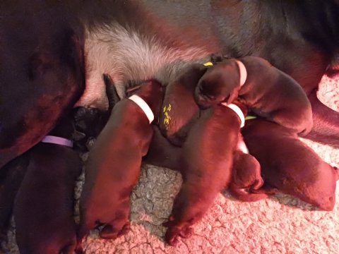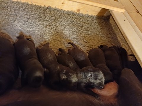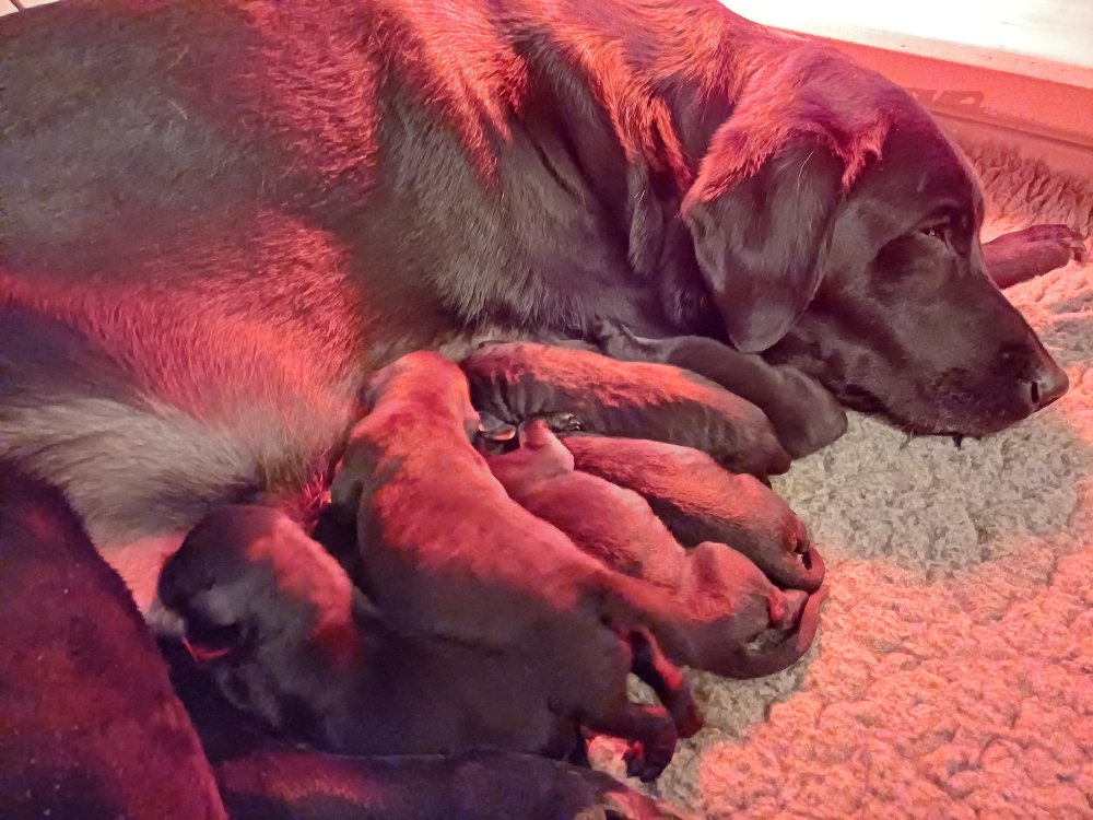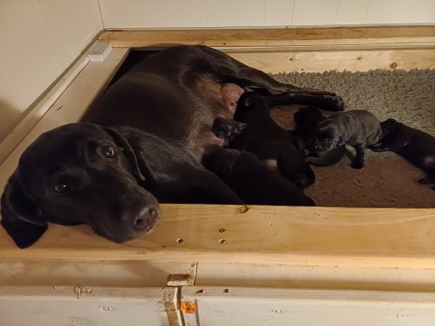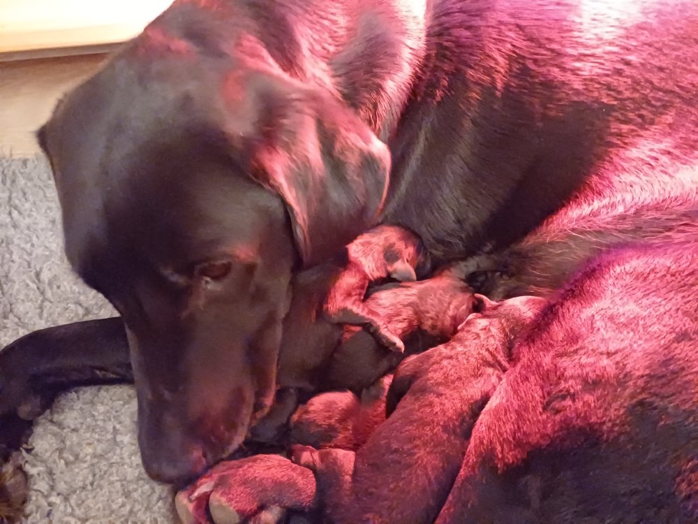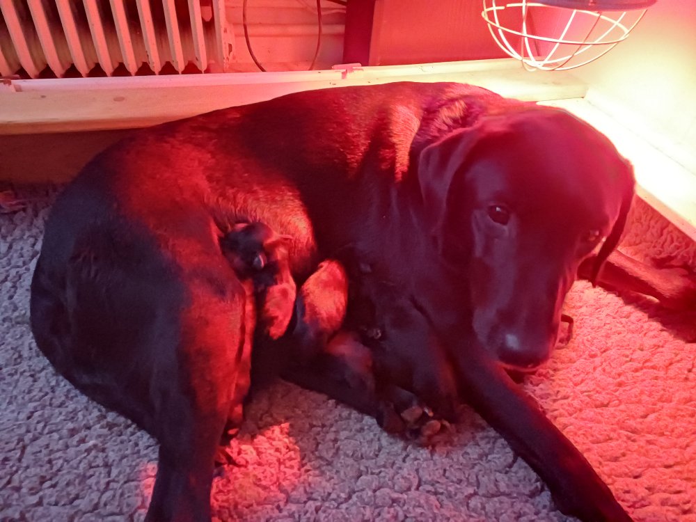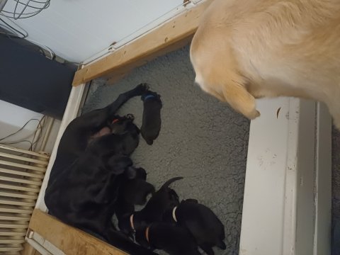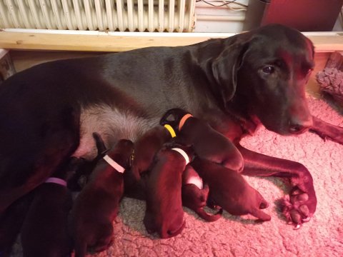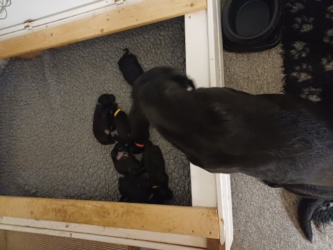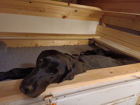 Vi er også begyndt at kunne ane små sprækker ved øjnene, så det bliver så spændende at se de små øjne, når de kommer frem. Kate er en rigtig god mor og hun nyder livet i hvalpekassen, hvor tiden stadig væk går tiden med at spise og sove. De andre hunde er tit inde og hilse på. Kate kommer også ind til os andre i stuen, når der ro i hvalpekassen for være sammen med resten af familien.