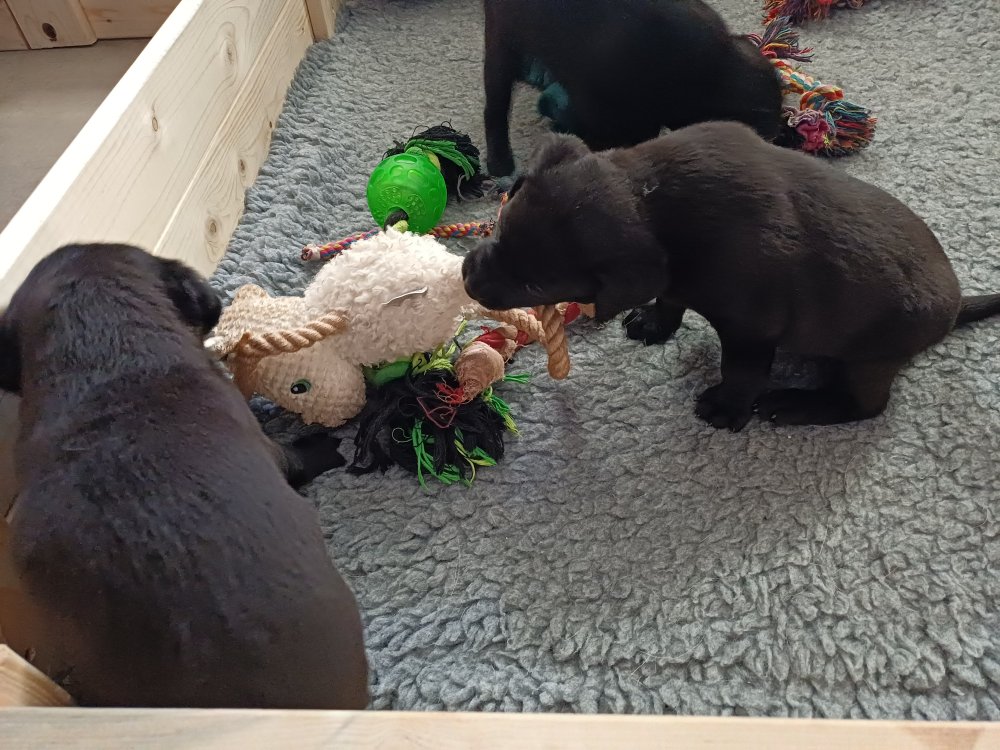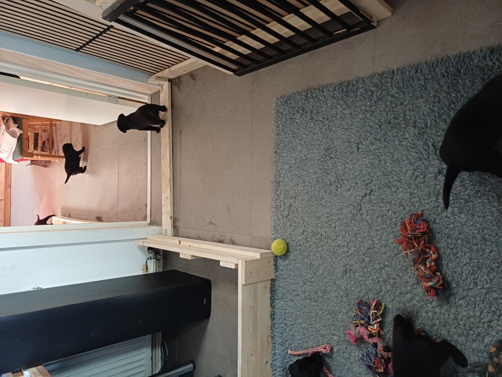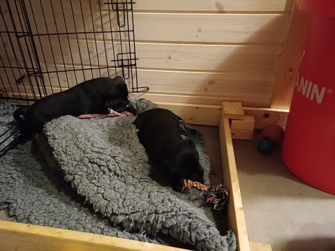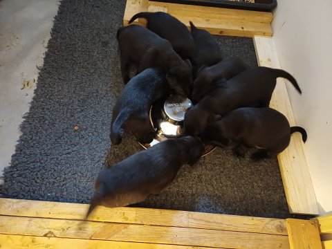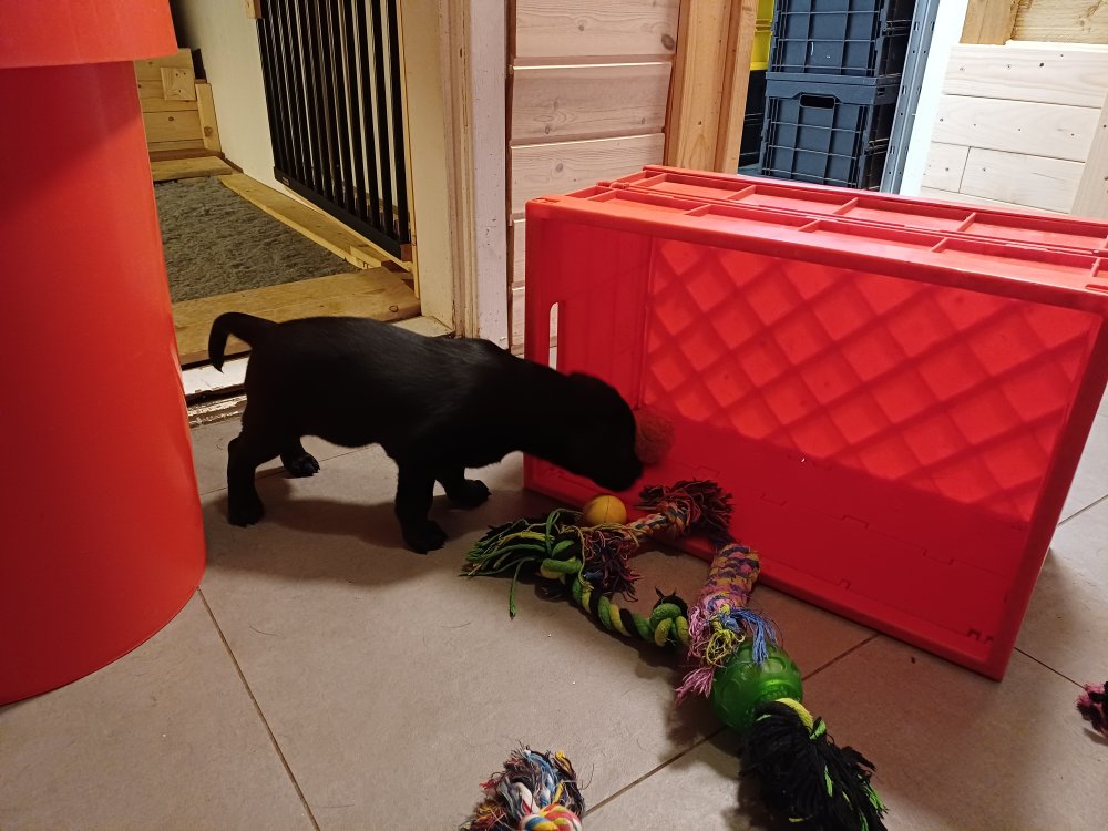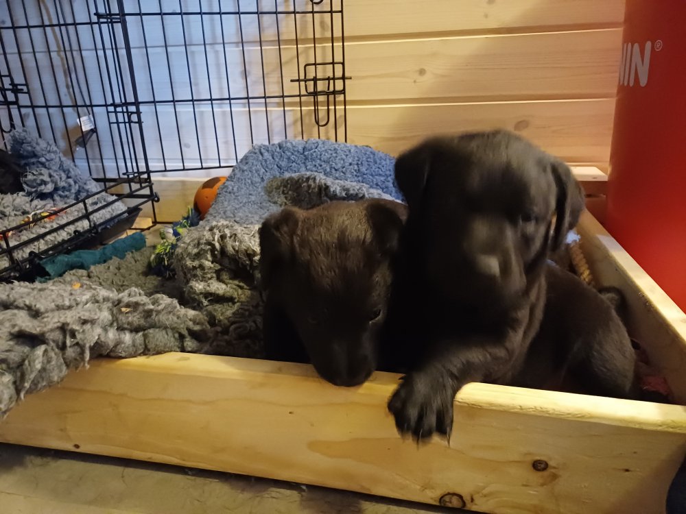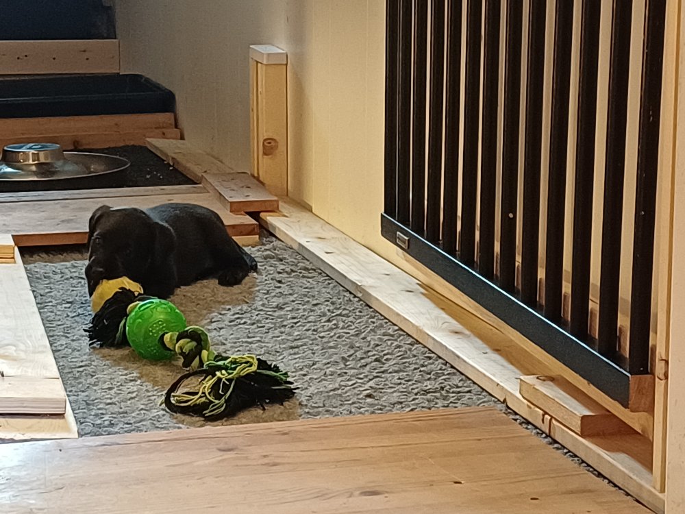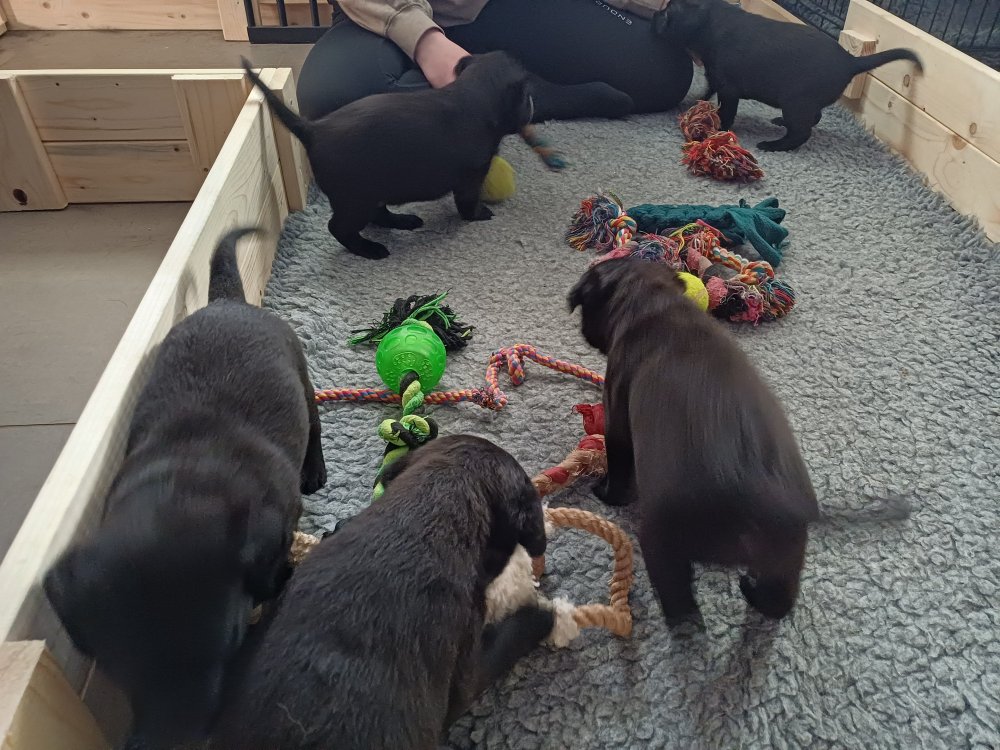 Uge 6 i hvalpekassen Hvalpene er nogle rigtig søde, nysgerrige og aktive hvalpe, der rigtig gerne vil snakke med. De har helt styr på hvornår der er spisetid og kommer så snart der bliver fløjtet. De får stadig lidt fra Kate´s mælkebar men det er i hold, da det er lidt hårde ved hende. Mormor Amy, tager sige af hvalpehyggen. Her i weekenden lukkede vi af til hvalperummet og hvalpene er flyttet ud i gangen og fået mere plads. De bruger nu baggangen som deres toiletområde og det er de rigtig gode til. Hvalpene har i denne uge været ude når vejret har været til dette, de nyder at komme udenfor også i " hvalpebørnehaven" og elsker at finde noget de kan tage i munden. De har fundet ud af at de kan se indtil os i stuen også kan de hilse på de andre hunde.