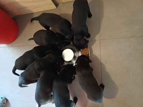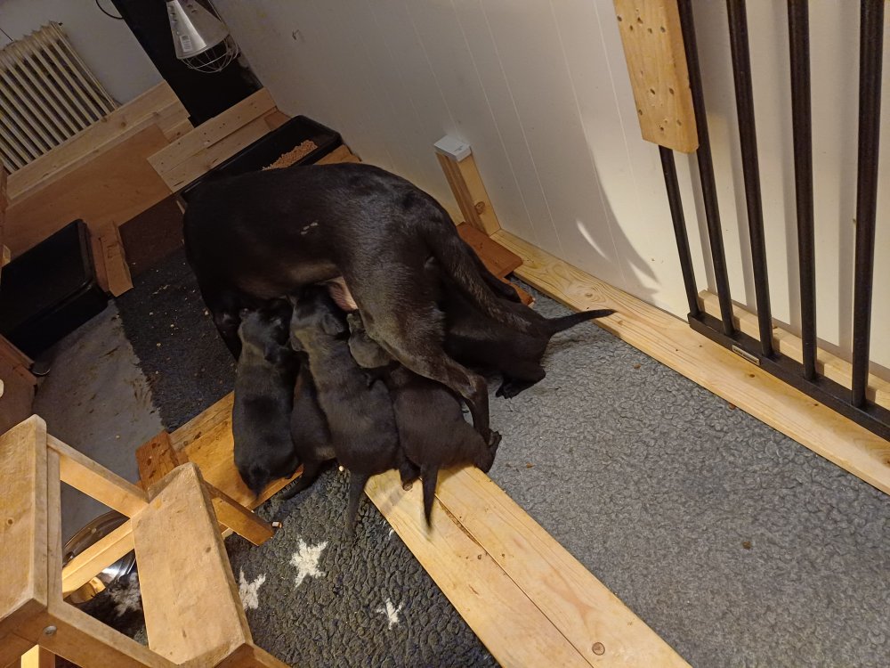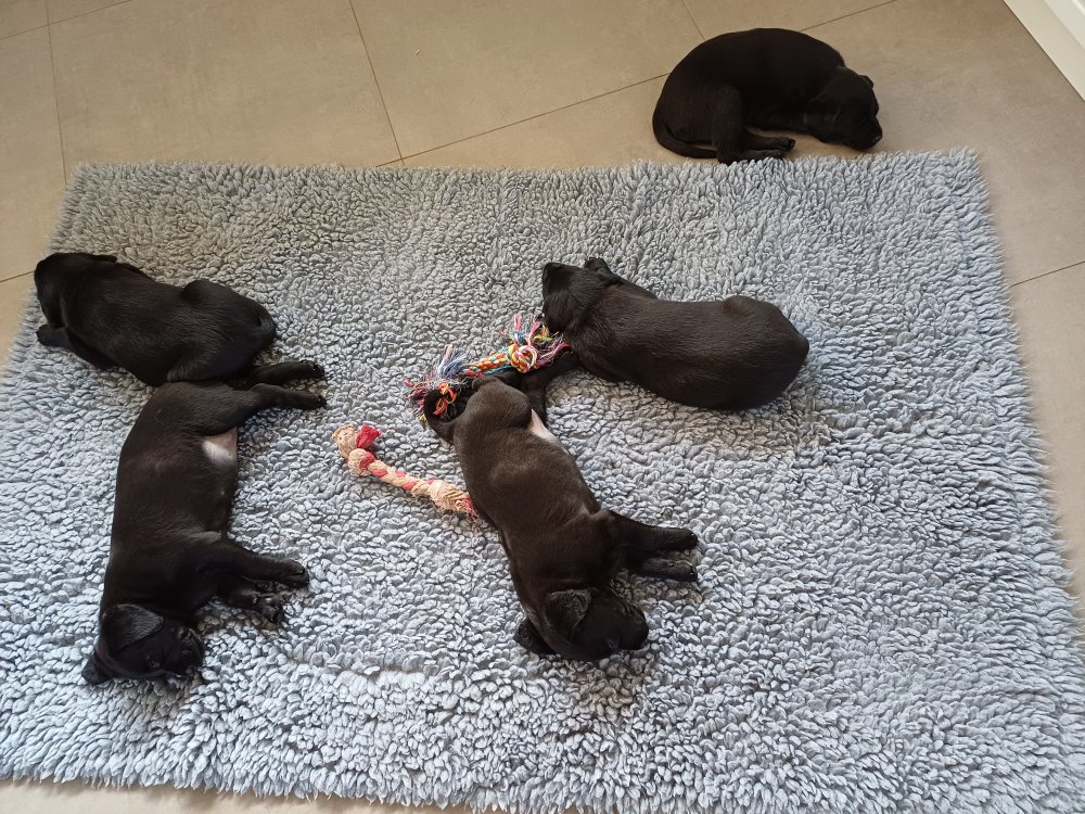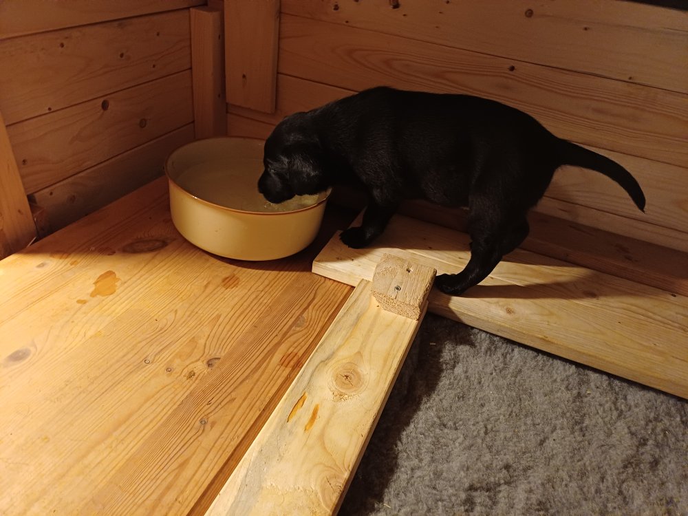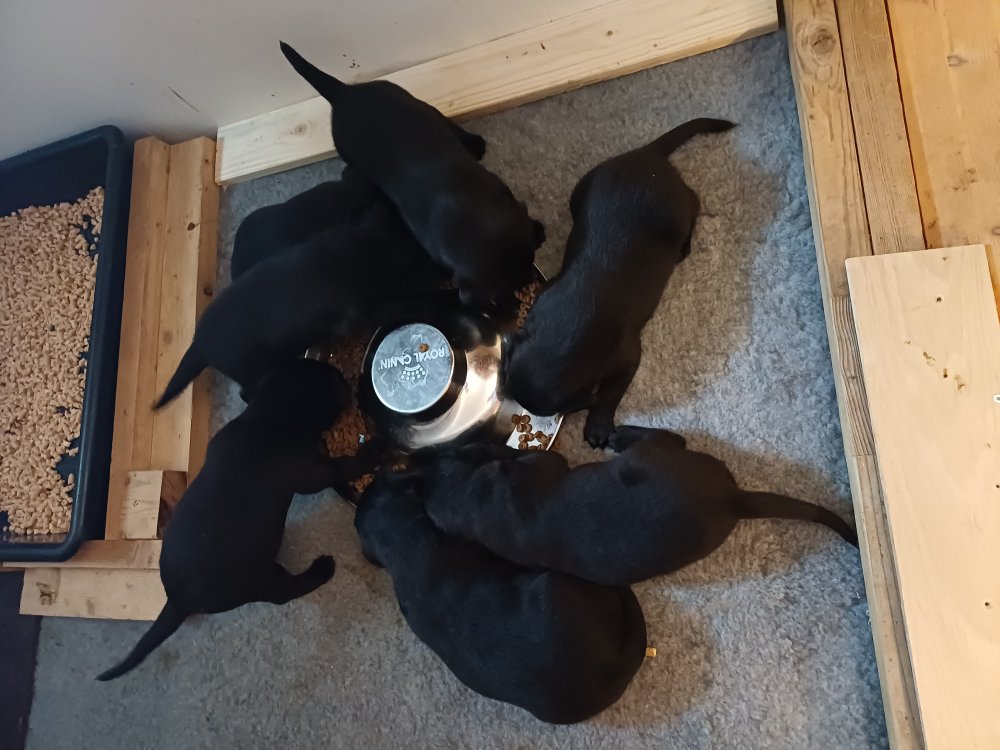 Uge 4 i hvalpekassen Hvalpene er flyttet ud af hvalpekasse og hvalpetoilette er kommet ind, så nu har de hele rummet.Når de er vågne, bliver der tumlet og prøvet kræfter med hinanden. Vi kan også se at de små hvalpetænder er ved at komme frem, så alt skal undersøges. Hvalpene får nu fast føde, opblødt hvalpefoder, og de er ved at være klar over at når der bliver fløjet kommer mad og bagefter er får mælk fra Kate´s mælkebar. Hvalpene har fået små fine hvalpetænder, så det er ikke altid rart at være Kate de bider sig fast, men hun nyder at ligge sammen med hendes hvalpe.